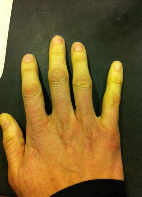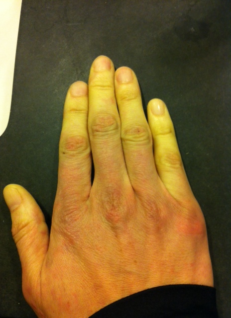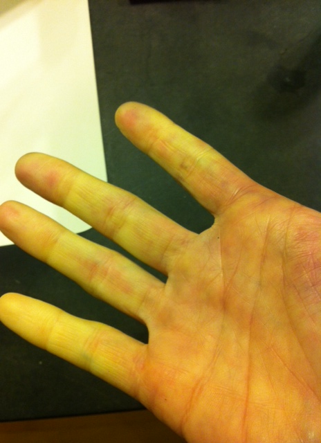 That strange yellow tinge? That’s not the lighting in the room. That’s the color of my hand in full Raynaud’s display. While my digits turn white and yellow, the upper part of my hand frequently turns purple, and then there are red spots across it. The same happens to my feet, and I am unable to bend my toes or put weight on my feet without pain. As they thaw, the entire hand becomes bright red and looks swollen.