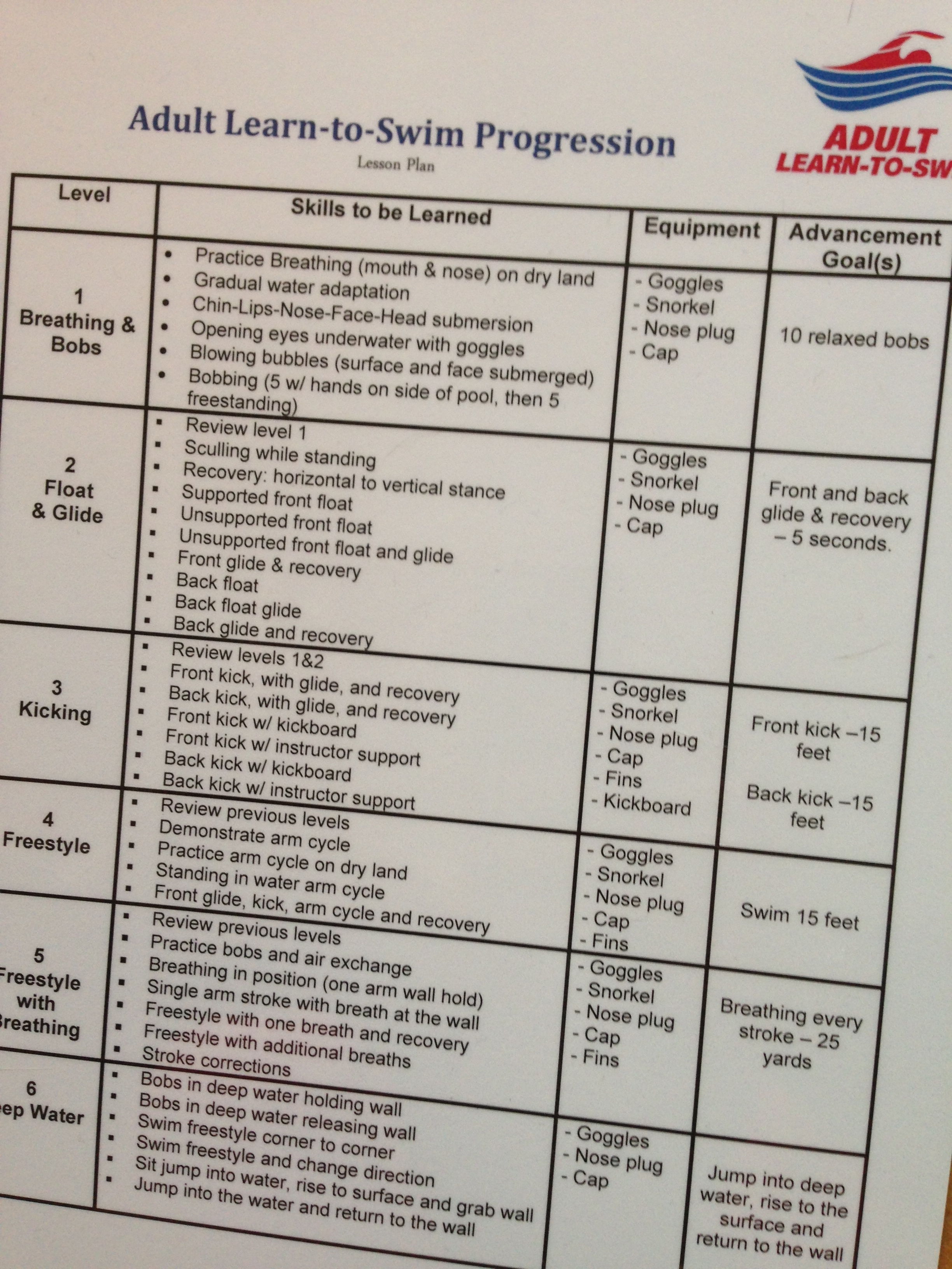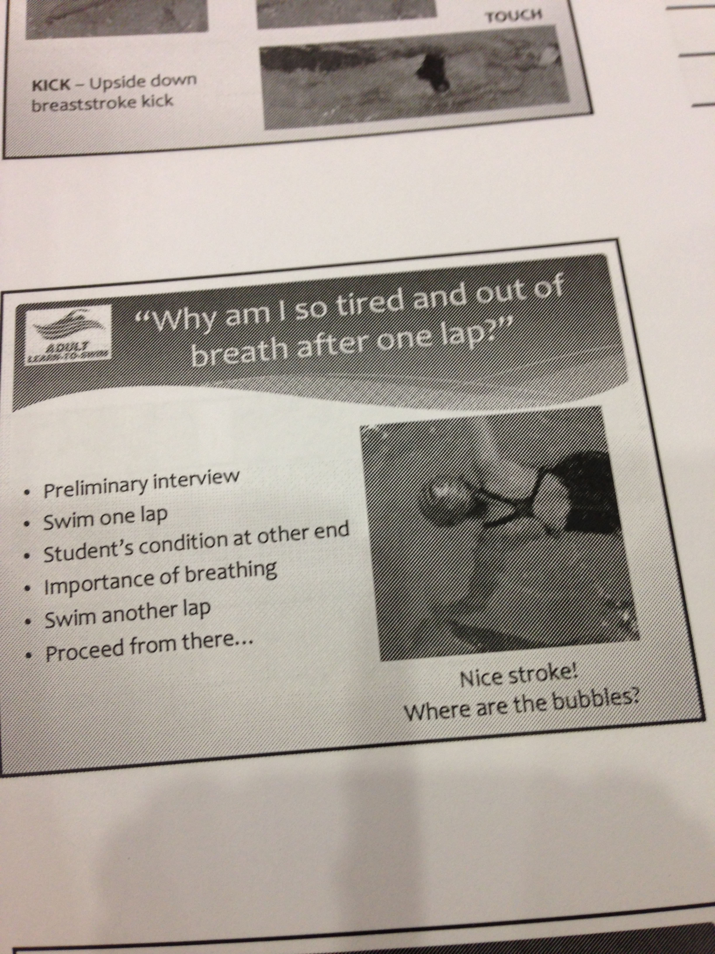 And we covered specific methods for instructing those who are new to the water, everything from how to help a fearful person feel comfortable before they even touch the water to helping someone learn to float or kick or breathe.