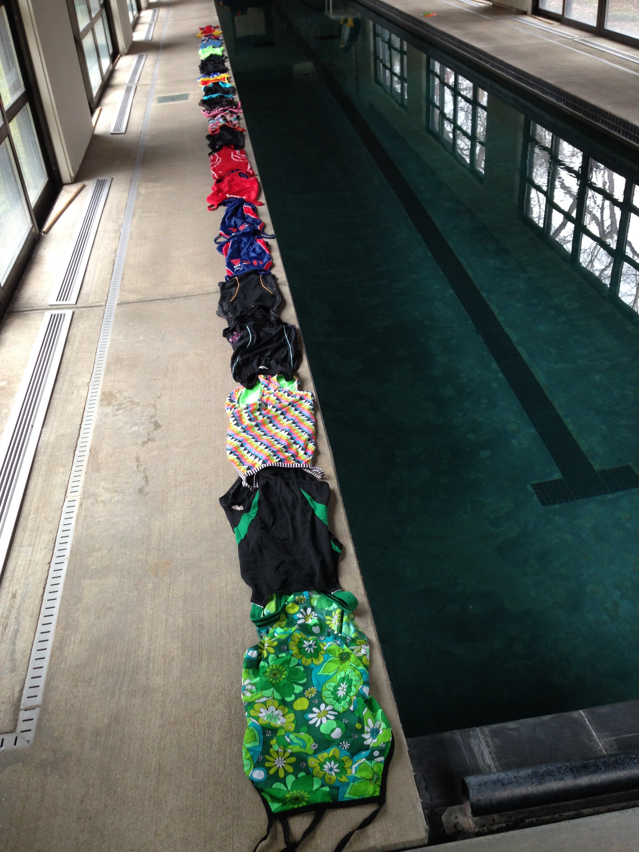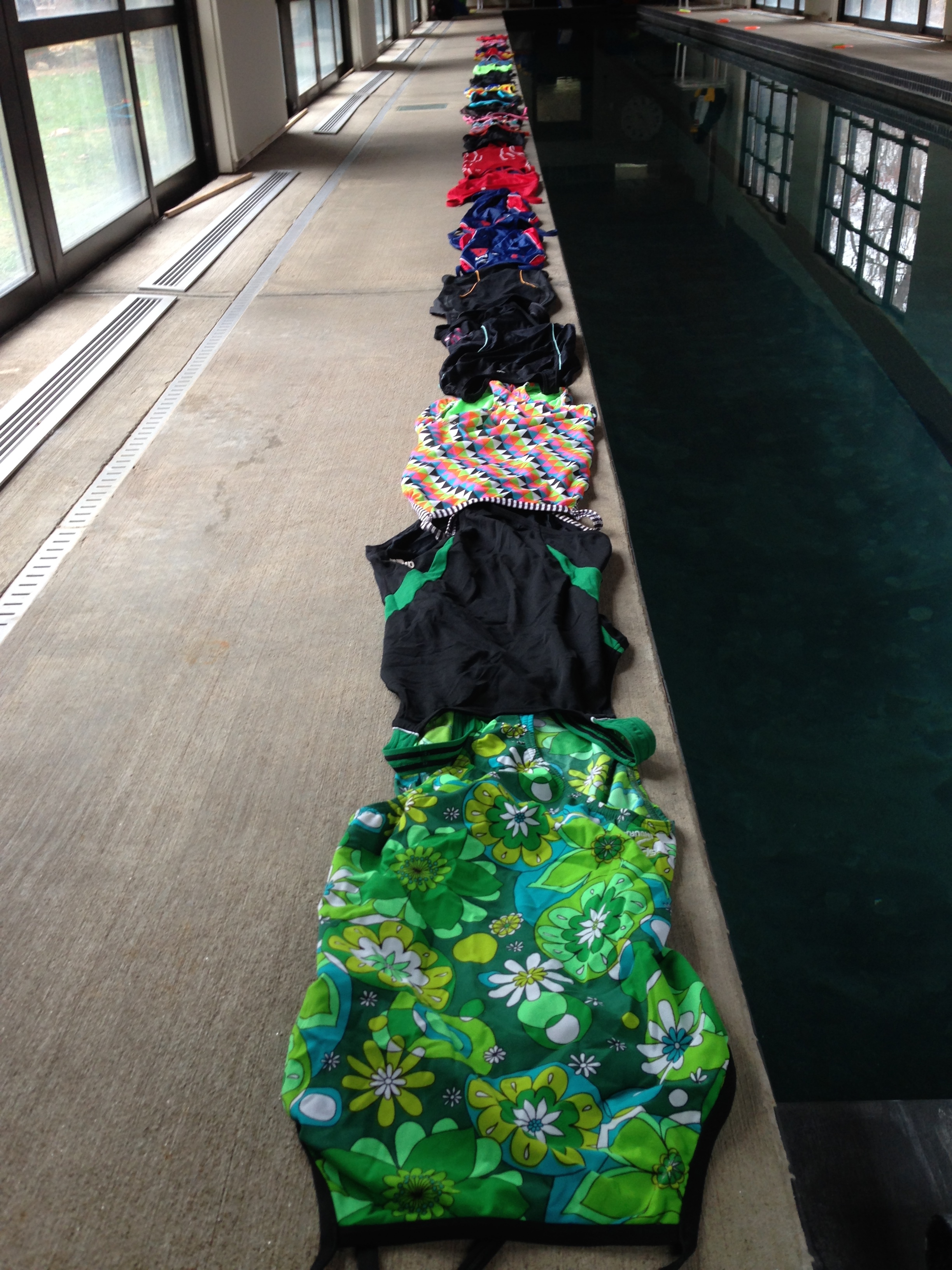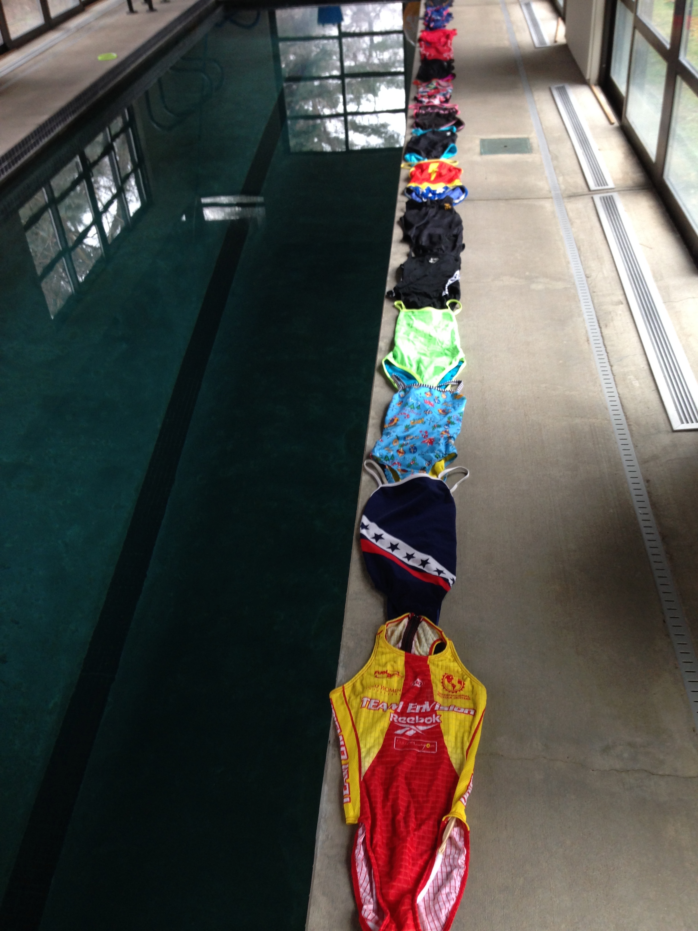 I decided to see if my suits could stretch to the moon and back, and while there are 25 current suits, it wasn’t quite enough for that distance. Instead, it was 14+ yards of lycra/polyester goodness, most with a history that means I can’t ever throw them away.