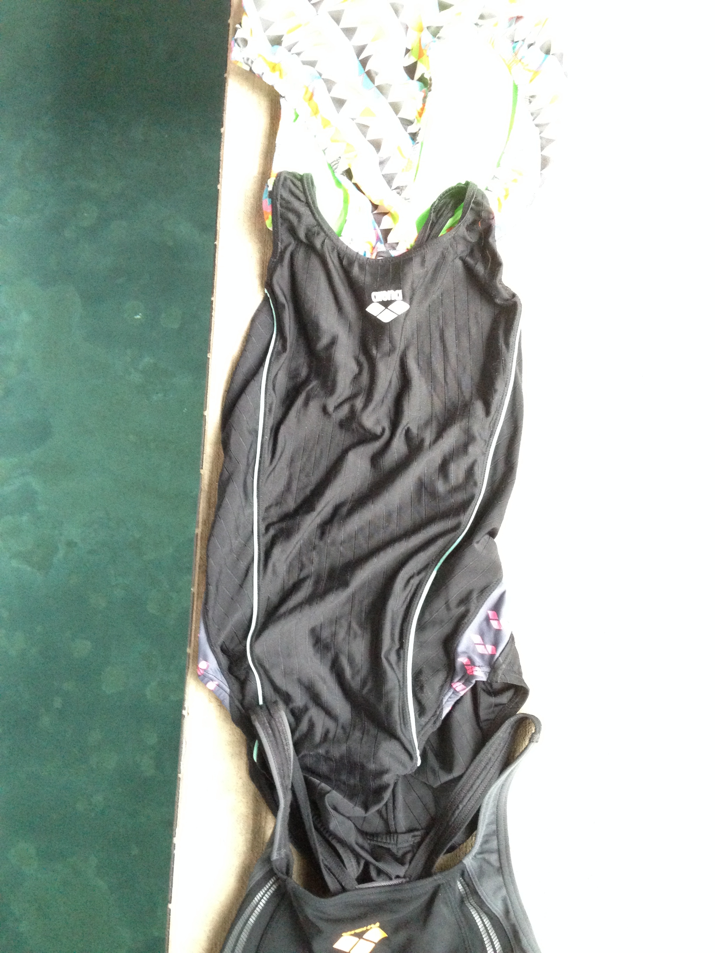 Then, you find one suit in your size. An Arena, black, with a few stripes of pink and green, and more interesting, modesty cups.